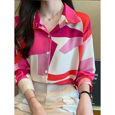 女孩和女式纯色人造丝彩色休闲版型翻领开衫衬衫彩色花朵印花长袖披肩有领开襟女式衬衫(衬衫 53)