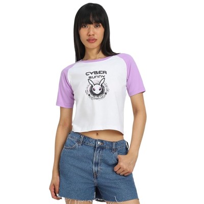 女式刺绣棉混纺民族和西式上衣纯棉常规版型圆领酷Cyber Bunny正面图案印花露脐上衣 女士和女孩